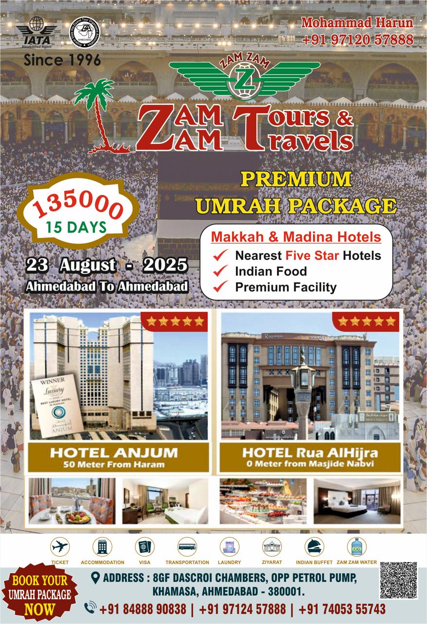 ✨ ZAM ZAM TOURS & TRAVELS – PREMIUM UMRAH PACKAGE ✨ 📆 Departure Date: 23rd August 2025 📍 From Ahmedabad to Ahmedabad 🕋 15 Days Spiritual Journey – Only ₹1,35,000/- 🔹 Since 1996 – Trusted IATA Approved Agent 🔹 Personalized services for your comfort & convenience 🔹 Stay in Top 5-Star Hotels Near Haram & Masjid-e-Nabvi 🏨 Hotel Anjum (50m from Haram) – Makkah 🏨 Hotel Rua AlHijra (0m from Masjid-e-Nabvi) – Madinah 🌟 Package Highlights: ✅ Premium Facilities ✅ Nearest Five Star Hotels ✅ Authentic Indian Buffet ✅ Free Laundry Services ✅ Guided Ziyarat Tours ✅ Visa, Ticket & Transportation Included ✅ Complimentary Zam Zam Water 🛫 Your journey begins with peace, devotion, and absolute comfort! 📍 Office: 8GF Dascroi Chambers, Opp. Petrol Pump, Khamasa, Ahmedabad – 380001 📞 Book Now: | +91 97120 57888 |+91 84888 90838 | +91 97124 57888 | +91 74053 55743 🌐 Follow your heart to the House of Allah – Book your spot today and embark on a divine experience with ZAM ZAM Tours & Travels!