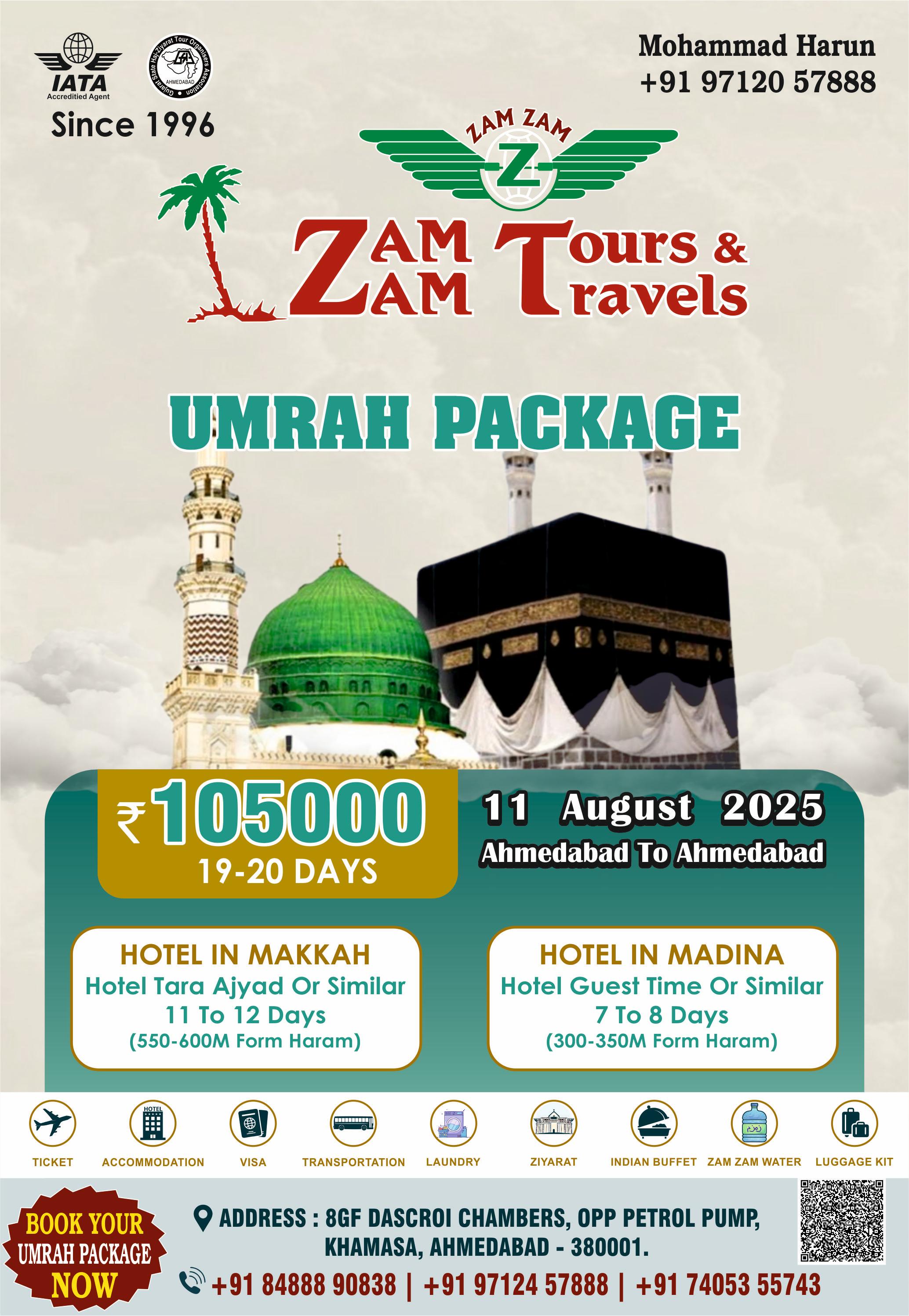 ✨ UMRAH PACKAGE 2025 ✨ Experience the spiritual journey of a lifetime with Zam Zam Tours & Travels – proudly serving pilgrims since 1996! 📍 Departure: 11th August 2025 🕋 Duration: 19–20 Days 💰 Package Cost: ₹1,05,000 🛫 Route: Ahmedabad to Ahmedabad 🏨 Stay Details: 🔹 Makkah: Hotel Tara Ajyad or similar (550–600M from Haram) – 11 to 12 Days 🔹 Madina: Hotel Guest Time or similar (300–350M from Haram) – 7 to 8 Days ✅ Inclusions: ✈️ Air Ticket | 🏨 Accommodation 🛂 Visa | 🚍 Transportation 🧺 Laundry | 🕌 Ziyarat 🍱 Indian Buffet | 💧 Zam Zam Water 🎒 Luggage Kit 📞 Contact: +91 97120 57888 |+91 84888 90838 | +91 74053 55743 | +91 97124 57888 | 📍 Address: 8GF Dascroi Chambers, Opp Petrol Pump, Khamasa, Ahmedabad – 380001 📌 BOOK YOUR UMRAH PACKAGE NOW! Travel with peace of mind and comfort – guided by years of trusted service. 🌙