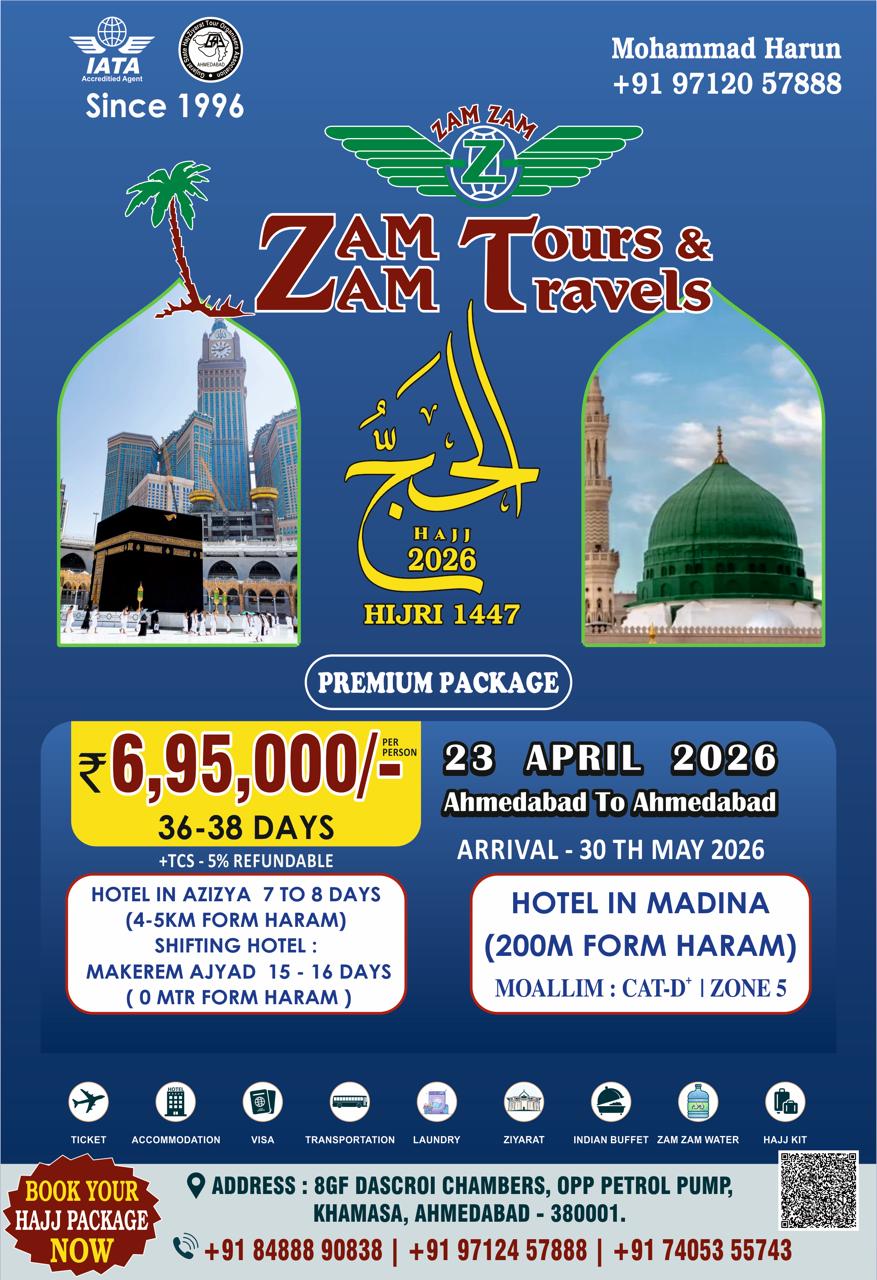 ๐ HAJJ 2026 PREMIUM PACKAGE | ZAM ZAM TOURS & TRAVELS โจ Experience the journey of a lifetime with Zam Zam Tours & Travels, serving pilgrims since 1996 with trust and excellence. ๐ Departure: 23rd April 2026 ๐ Arrival: 30th May 2026 ๐ From Ahmedabad to Ahmedabad ๐ฐ Package Price: โน6,95,000/- per person (36โ38 Days) ๐ TCS 5% Refundable ๐จ Stay Includes: Aziziya Hotel: 7โ8 Days (4โ5 km from Haram) Shifting Hotel in Makkah: Makarem Ajyad โ 15โ16 Days (0 meters from Haram) Madina Hotel: 200 meters from Haram ๐ Moallim: Category D | Zone 5 ๐งณ Package Inclusions: Air Tickets โ๏ธ Hotel Accommodation ๐จ Visa Processing ๐ Transportation ๐ Laundry Service ๐งบ Ziyarat ๐ Indian Buffet ๐ Zam Zam Water ๐งด Hajj Kit ๐ ๐ Contact Today: Mohammad Harun: +91 97120 57888 +91 84888 90388 | +91 74053 55743 | +91 97124 57888 ๐ Office Address: 8GF Dascroi Chambers, Opp. Petrol Pump, Khamasa, Ahmedabad โ 380001 ๐ข BOOK YOUR HAJJ PACKAGE NOW AND EMBARK ON A SACRED JOURNEY WITH PEACE OF MIND!